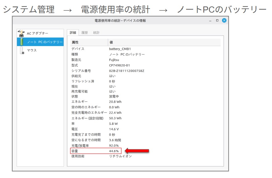 - Linux Mint → 「システム管理」 → 「電源使用率の統計 」→ 「ノートPCのバッテリー」で詳細確認